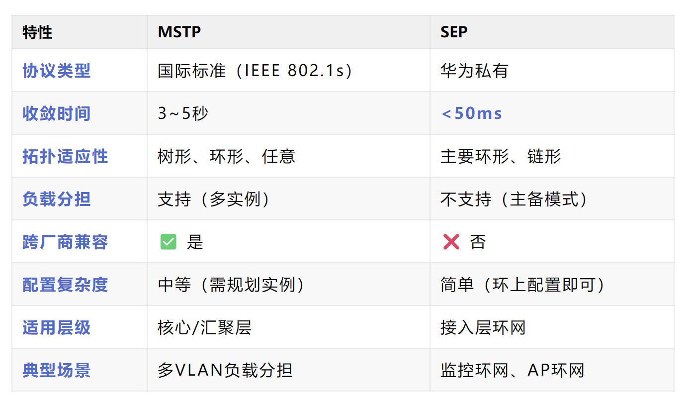 - 优先标准化:能用MSTP就不用SEP,除非对收敛有极致要求