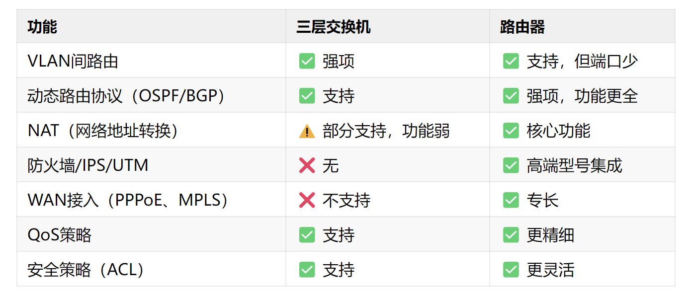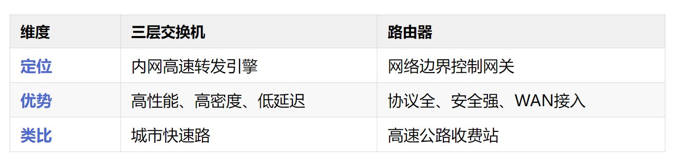 三层交换机擅长“内网提速”,路由器擅长“对外连接与安全控制”。