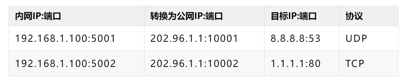 - 记录:192.168.1.100:5001 ↔ 202.96.1.1:10001