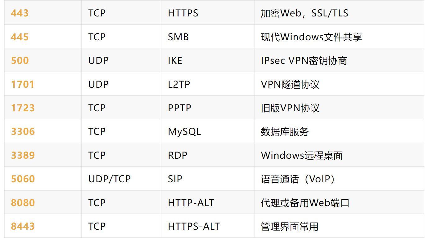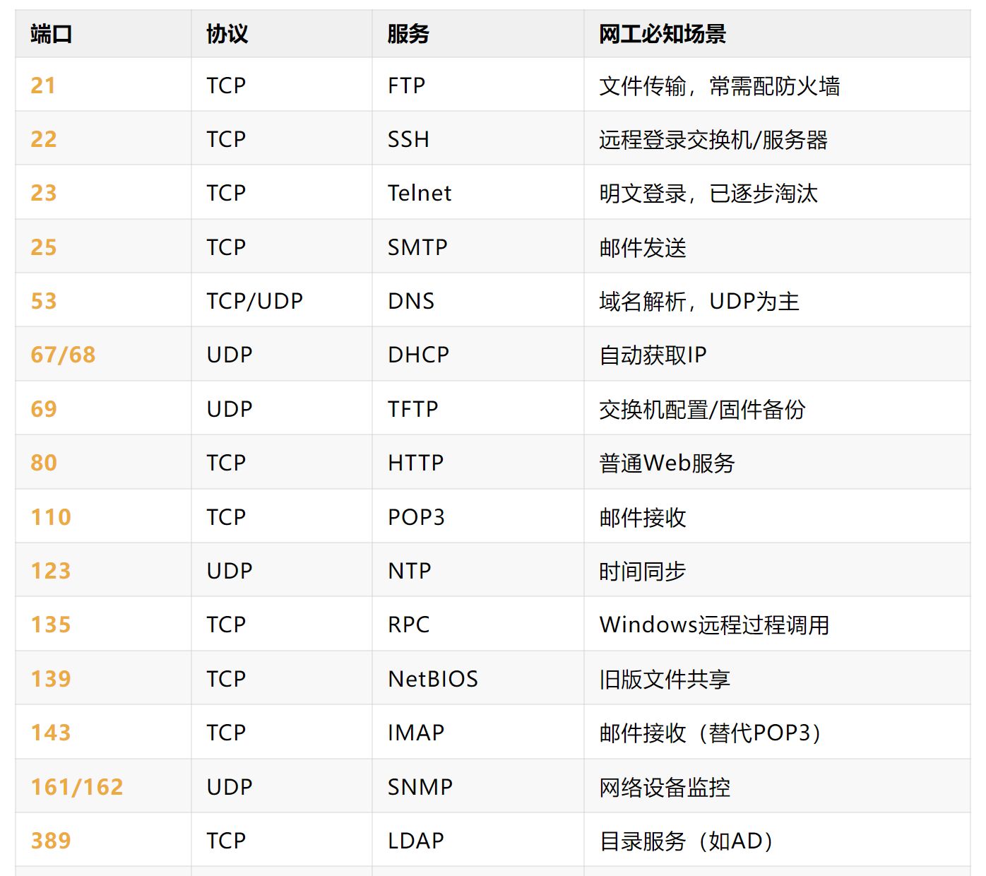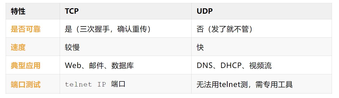 必须熟练掌握常见端口及其协议类型,尤其是TCP与UDP的根本区别。
