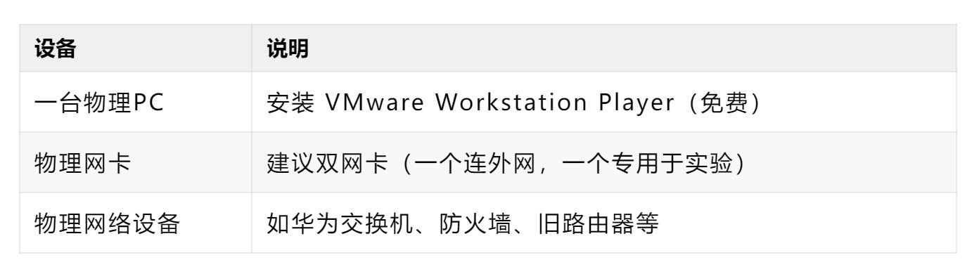 但你可能不知道:利用 VMware Workstation(免费版) + 少量物理设备,就能搭建一个 虚实结合的混合实验室,实现接近真实环境的测试。