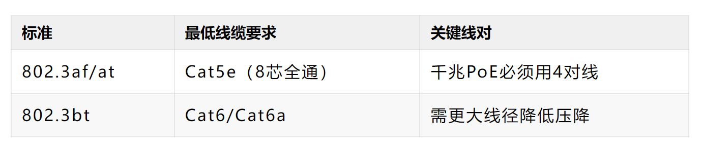 ⚠️ 关键前提:交换机、线缆、终端三者必须兼容同一PoE标准。