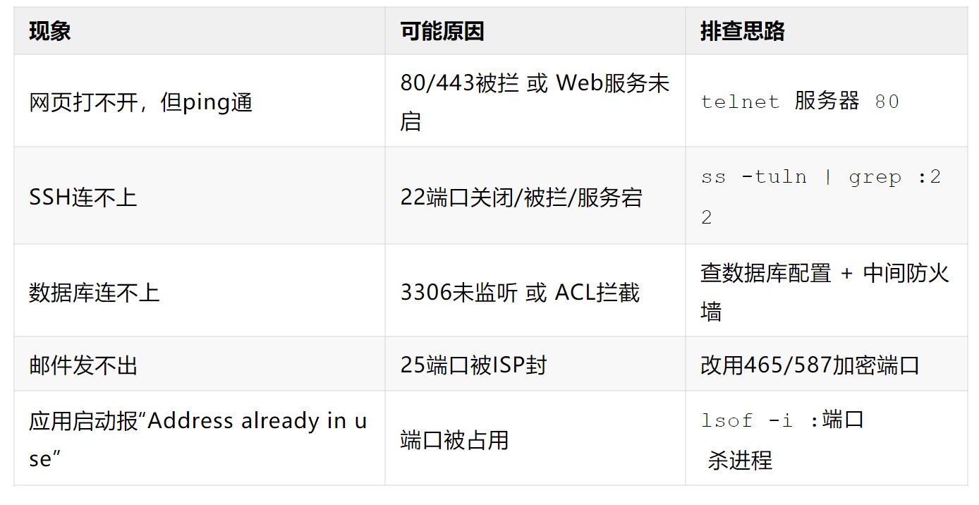 ✅ 排障重点: 服务“起不来”?先看是否 LISTEN; 连不上?看中间是否有防火墙拦了该端口。