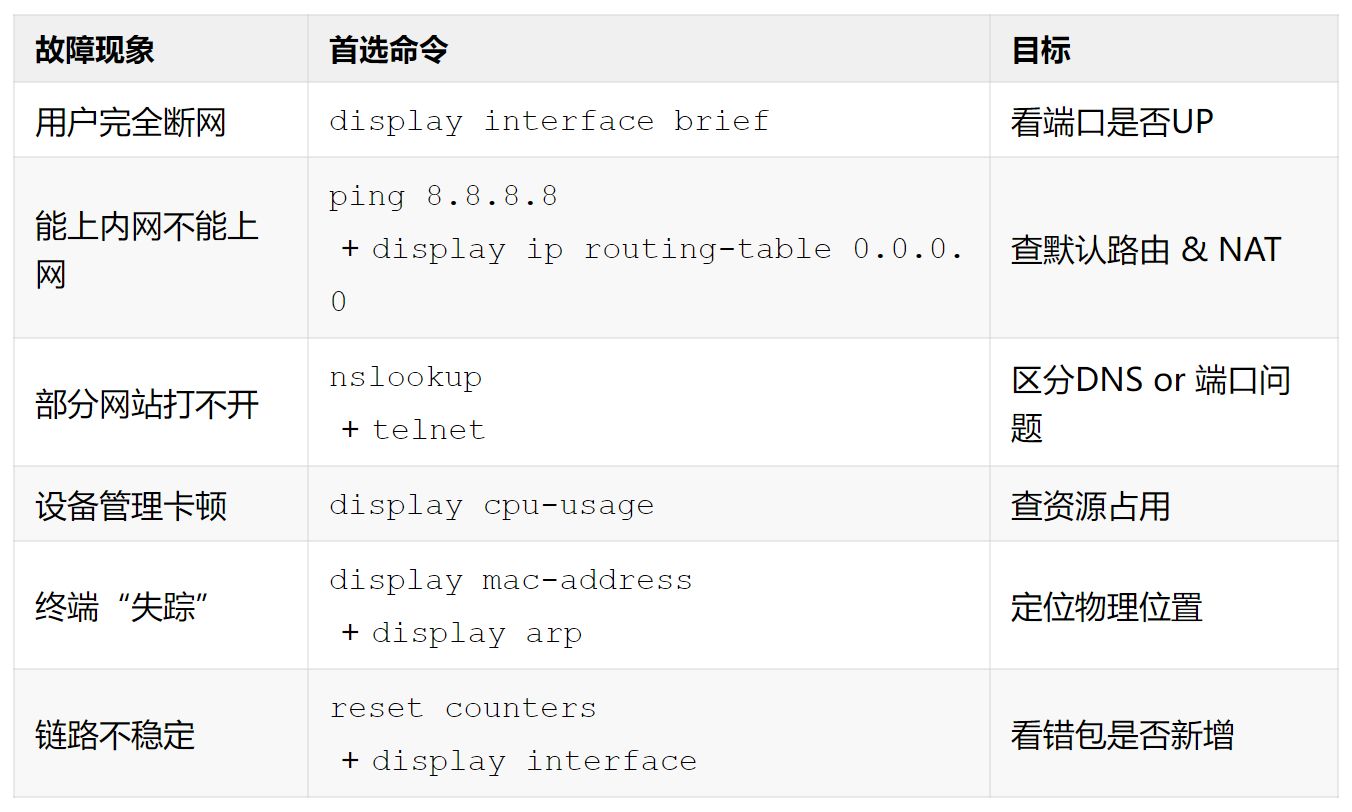 今天给大家整理网络排错中最实用、最高效的10个核心命令,覆盖连通性、配置、路由、安全、性能五大维度,无论面对终端掉线、跨网段不通,还是设备卡顿,都能做到:快、准、稳。