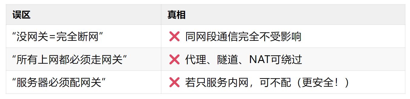 安全优势: 无网关的主机无法主动访问外网,天然具备出向隔离效果。