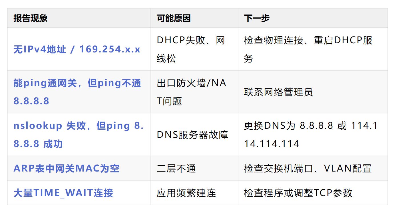 ✅ 信息完整:一次性收集IP、路由、DNS、连接状态等