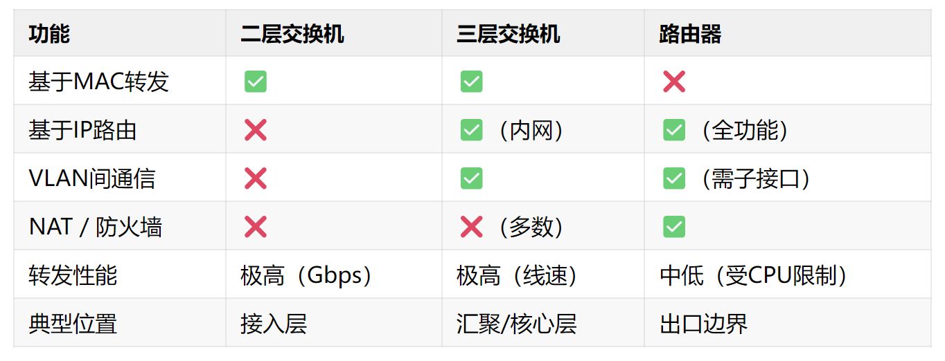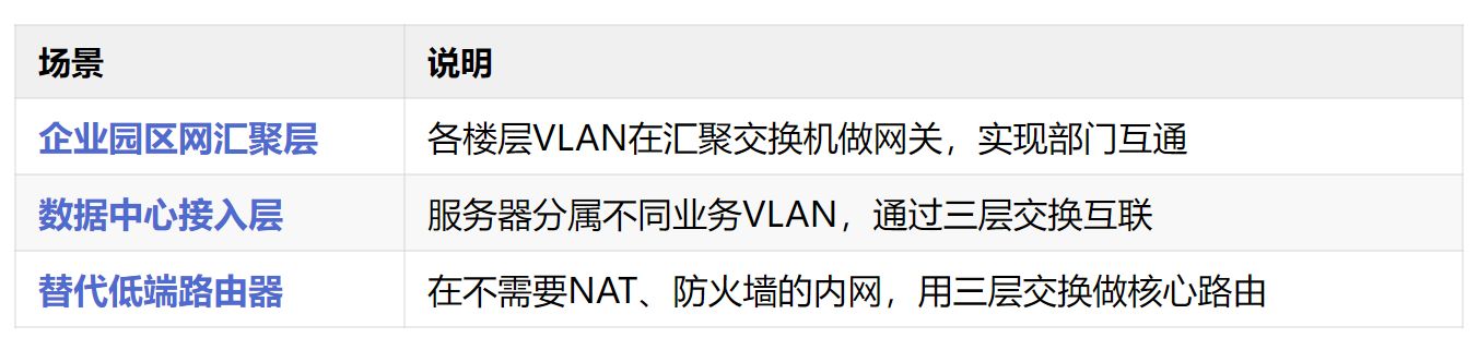 📌 注意:三层交换机通常不支持NAT、IPSec、高级ACL(部分高端型号除外),不适合直接连外网。