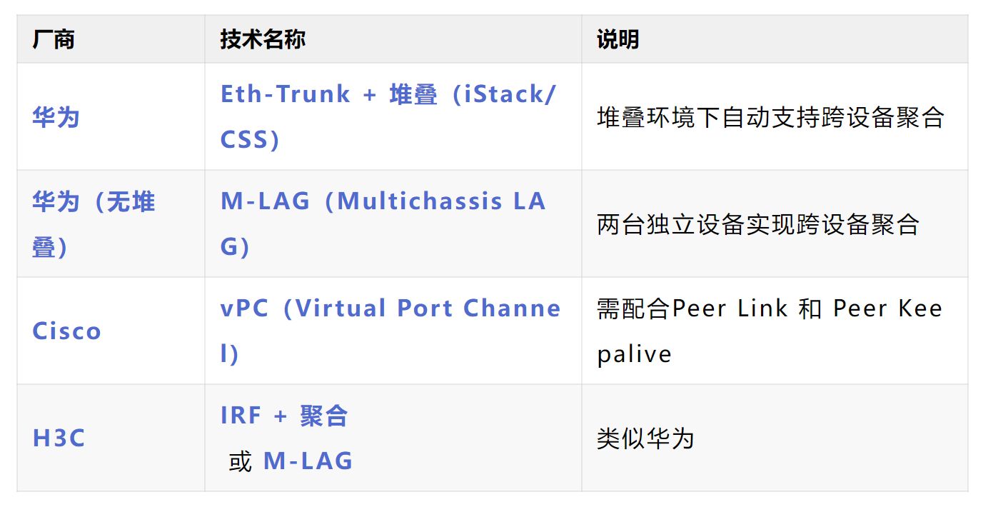 ✅ 关键前提: 必须使用厂商指定的跨设备聚合机制,不能直接用普通LACP!