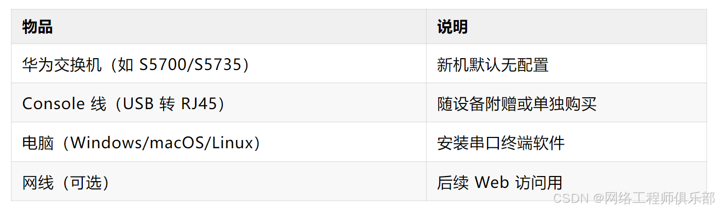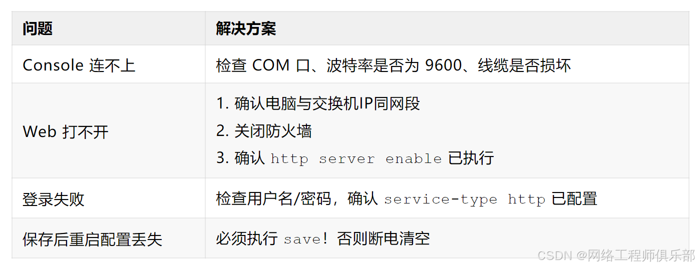 很多朋友被“命令行”吓退,却不知道华为交换机的首次配置,核心就三件事:设管理IP、建账号、开Web。