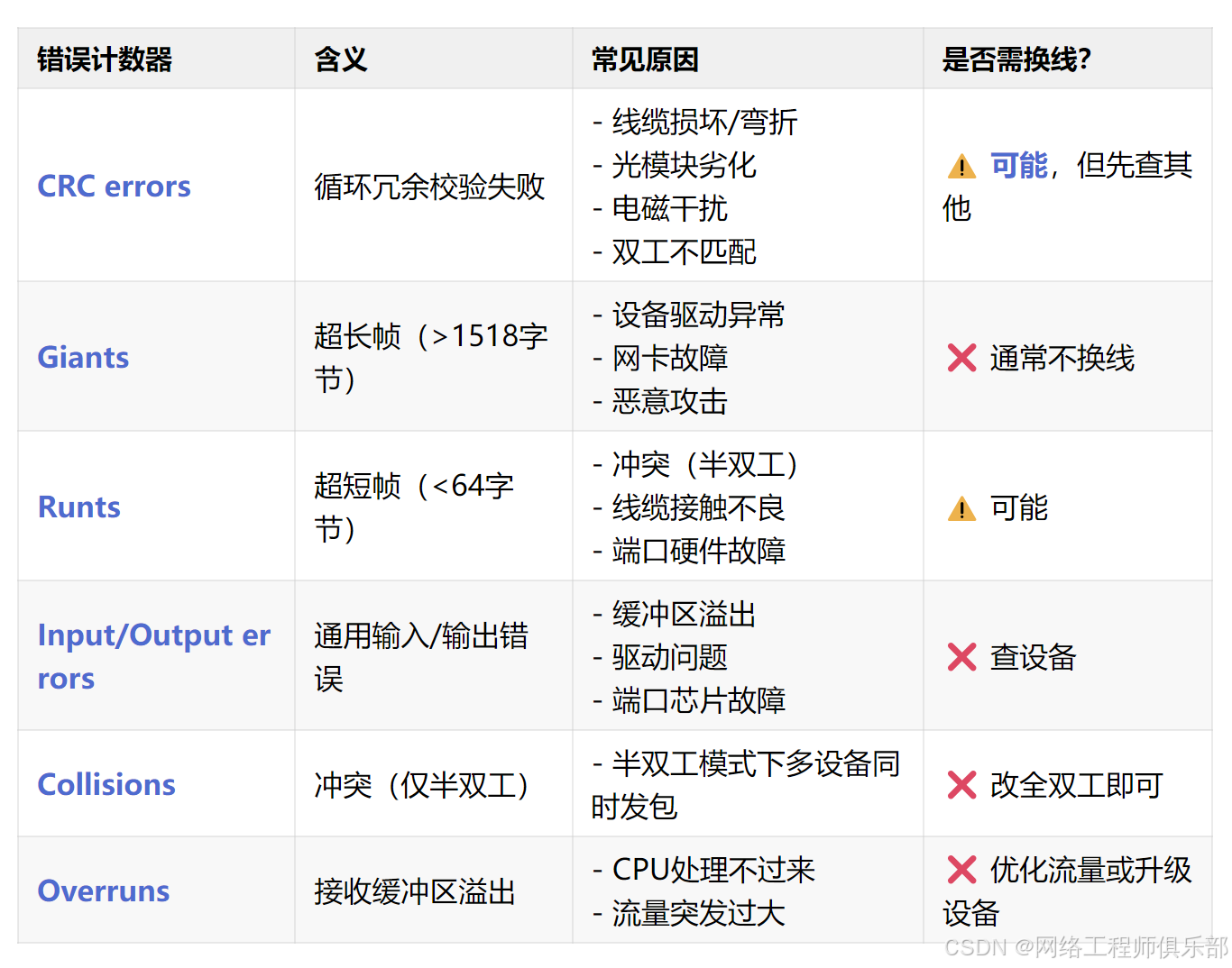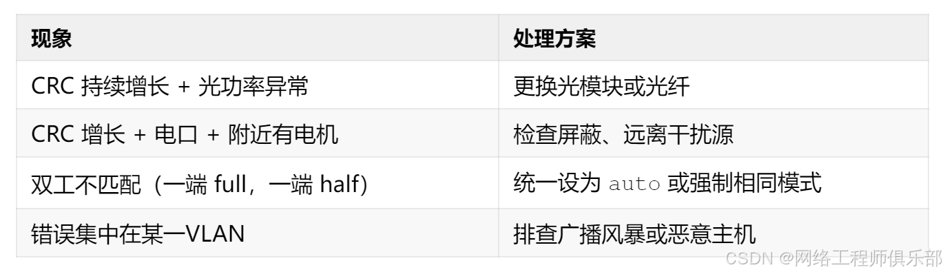 📌 黄金法则: CRC + Runts 持续增长 → 怀疑物理层(线缆/模块) 其他错误 → 优先查配置、驱动、设备状态