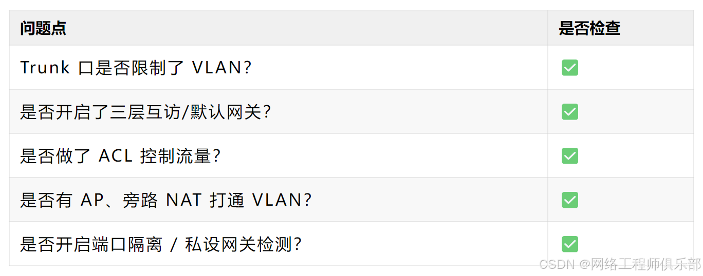port trunk allow-pass vlan 10等限制;非必要不要 Access 接 Trunk,接口模式要一一核对;