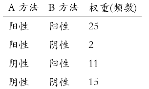 - 如果数据是原始数据格式,即每行代表一名患者,共有53行,每行包含A方法和B方法的诊断结果,则无需权重。
