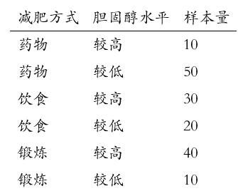 假设我们想研究不同减肥方式(药物、饮食、锻炼)对胆固醇水平(较高、较低)的影响。我们收集了以下数据: