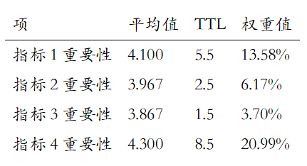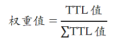 根据TTL值,计算每个指标的权重值。权重值的计算公式为: