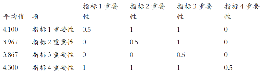 根据指标的平均值,构建优序图权重计算表。表格中的数字表示指标之间的相对重要性: