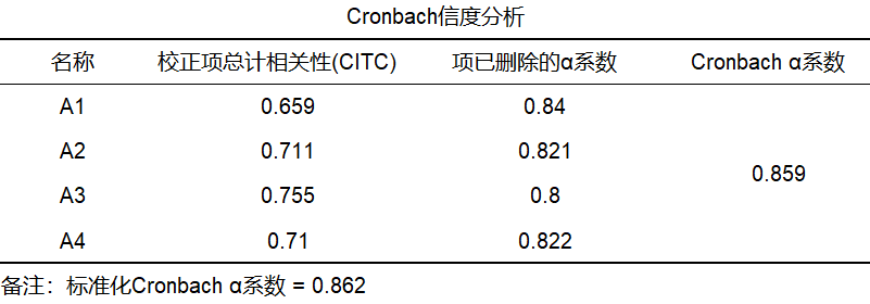 点击“开始分析”按钮,SPSSAU将自动计算Cronbachα系数并输出结果。