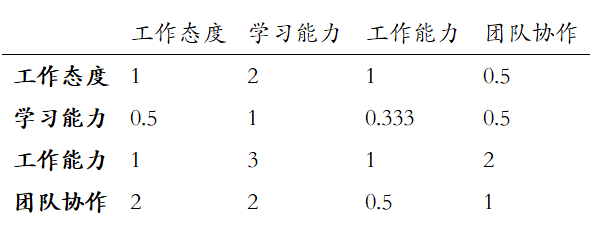 例如,对于准则层的四个指标,判断矩阵可能如下: