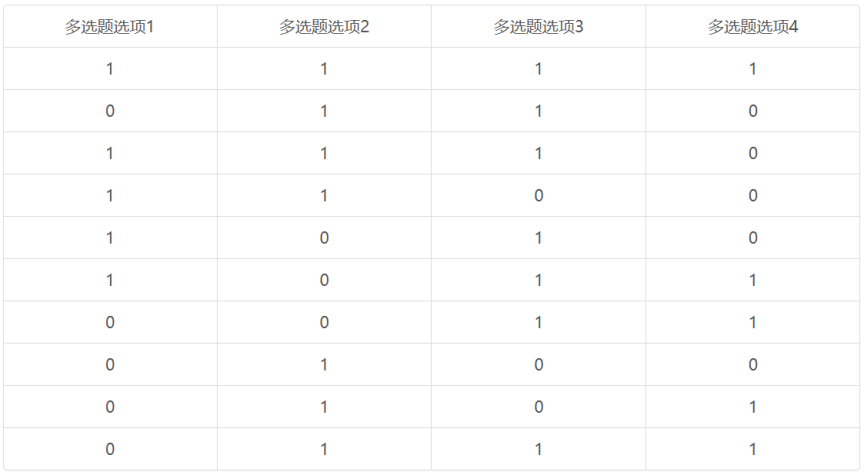 多选题的数据格式通常为“1列为1个选项”,即每个选项对应一列,选中用数字1表示,未选中用数字0表示。例如,一个多选题有4个选项,数据格式如下: