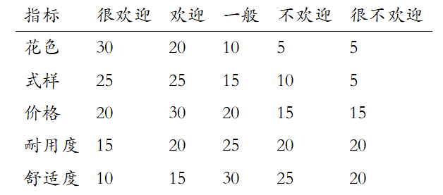 - 明确评价对象的各个评价指标。例如,服装评价的指标集为花色、式样、价格、耐用度、舒适度。
