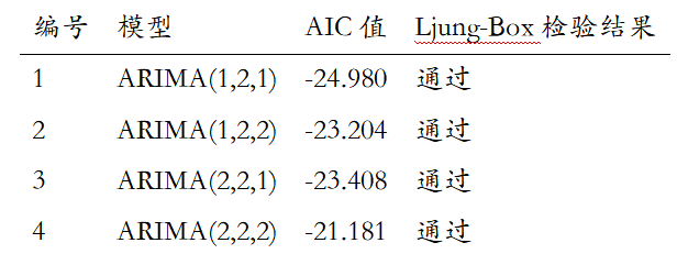 从表中可以看出,ARIMA(1,2,1)模型的AIC值最低,且通过了Ljung-Box检验,因此选择该模型作为最优模型。