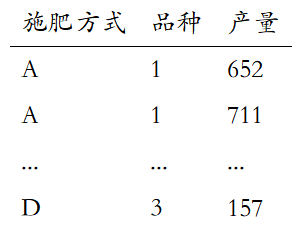 研究不同施肥方式(A、B、C、D)和不同水稻品种(1、2、3)对产量的影响,以及施肥方式和品种是否存在交互作用。