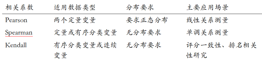 - 如果数据服从正态分布且无明显异常值,优先选择Pearson