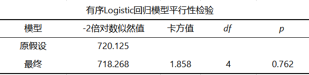 平行性检验是有序Logistic回归分析的前提条件,也称为比例优势假设检验。它检验的是:不同分割点(即因变量Y的不同类别)的回归方程中,各自变量的回归系数是否相同。