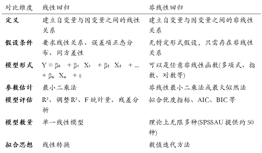 - 非线性回归:需要选择特定非线性函数表达式(如二次曲线、指数函数等),并可设置参数初始值