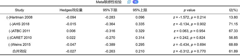 如果剔除任一研究后,合并效应量未发生显著变化,说明结果稳健;反之,则提示结果可能受个别研究过度影响。