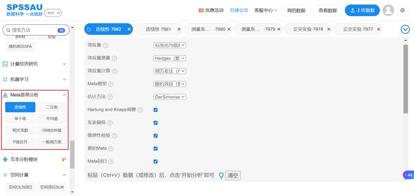 SPSSAU作为一个在线统计分析平台,其Meta分析模块具有以下特点: