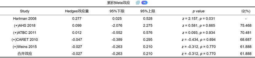 累积Meta分析是一种按时间顺序逐步累加研究的方法,可以展示证据积累的过程。其结果通常以表格或图表形式呈现,显示每增加一个研究后合并效应量的变化。
