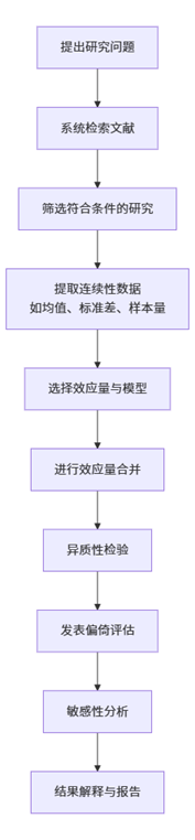 在进行任何Meta分析之前,研究者需要明确研究问题、制定检索策略、筛选文献、提取数据,并最终进行统计合成。下图展示了一个典型的连续性数据Meta分析流程: