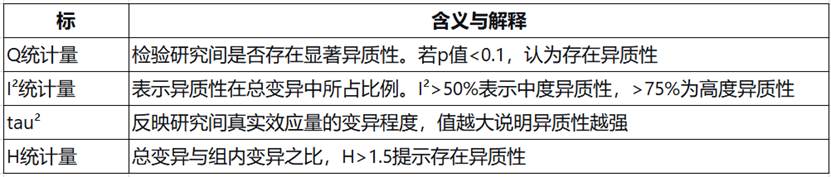 异质性检验是Meta分析中的核心环节,其目的是评估各研究结果之间的变异程度。下表列举了常用的异质性指标: