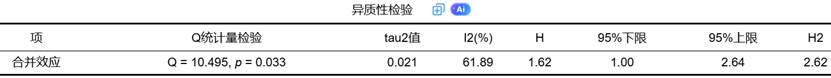 在SPSSAU中,异质性检验结果会自动输出Q值、I²、tau²等指标,并给出模型建议,极大方便了非统计背景的研究者。
