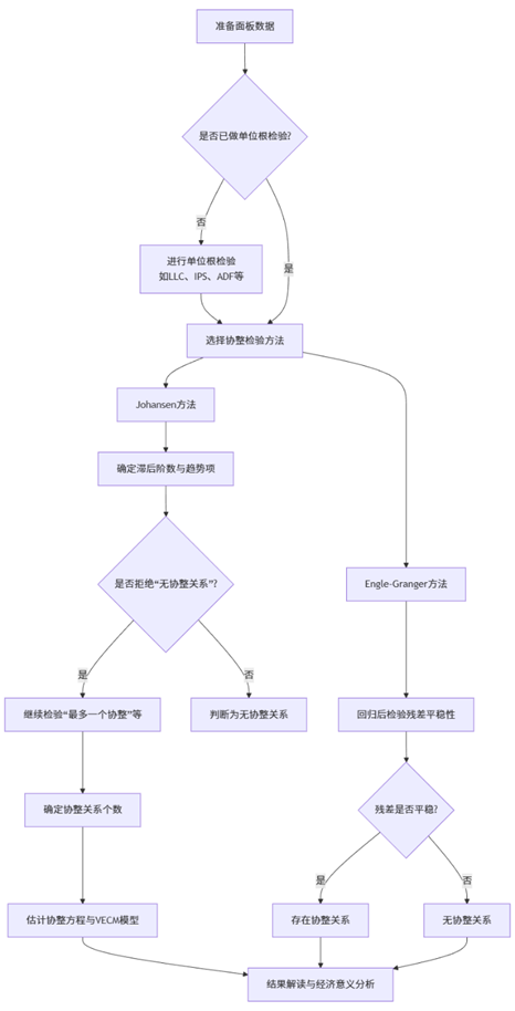 流程图解读:该图展示了面板数据协整检验的完整分析路径。从数据准备开始,需先进行单位根检验确认变量的平稳性,随后选择协整方法。若使用Johansen法,需确定滞后阶数与趋势项形式,并逐步检验协整关系的个数;若使用EG两步法,则需检验回归残差的平稳性。最后,根据检验结果估计模型并解读经济含义。