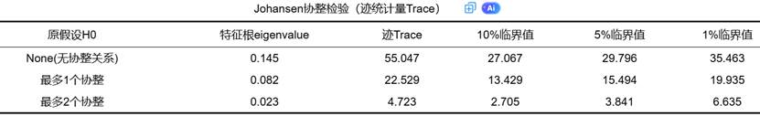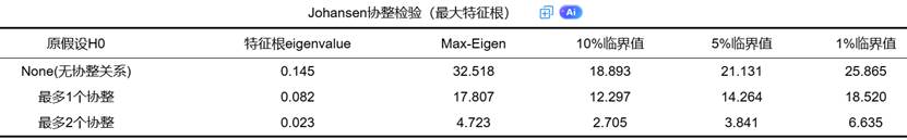 - 在5%水平上不拒绝“最多2个协整”,说明系统中存在2个协整关系。