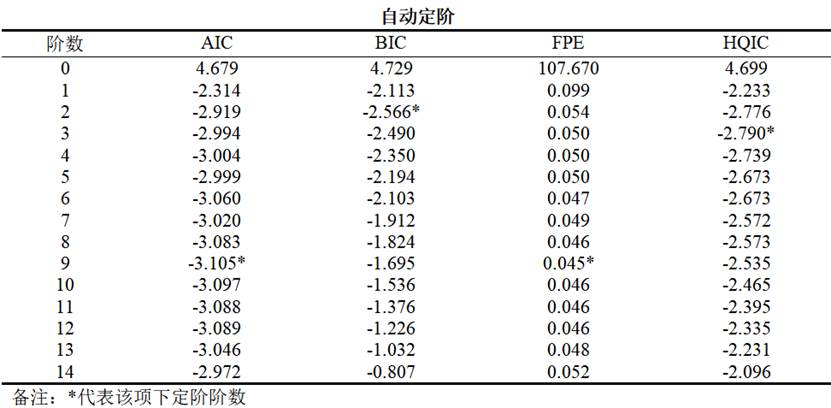 SPSSAU在后台会基于信息准则(AIC、BIC、FPE、HQIC)自动选择最优滞后阶数。以下是本次示例的定阶结果: