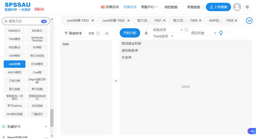 在实际操作中,如何快速、准确地完成协整检验?这里我们以SPSSAU平台为例,展示其协整检验模块的操作与输出解读。