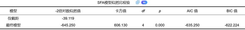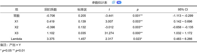 - λ的显著性:如果λ的*p*值显著(如<0.05),则说明模型中确实存在不可忽略的技术无效率。如果不显著,则意味着技术无效率项不重要,使用SFA模型可能没有必要,传统的OLS或许更合适。