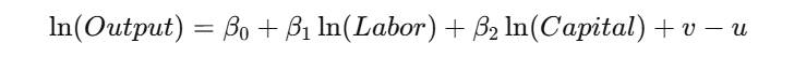 产出 = f(投入) + 随机误差项 (v) - 技术无效率项 (u)