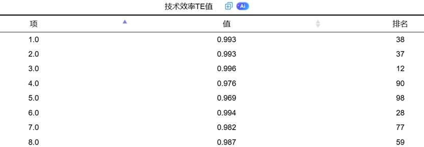 在SPSSAU的分析结果中,会提供一个详尽的技术效率值表格,包含每个样本的TE值及其排名,并给出描述性统计(平均值、中位数、最小值、最大值、标准差),方便研究者从整体上把握样本的效率分布情况。