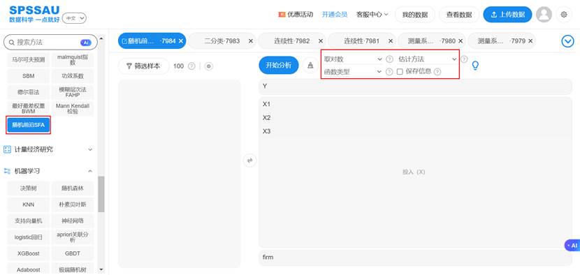 SPSSAU的随机前沿分析(SFA)模块,将上述复杂的理论模型和计算过程封装成一个用户友好的界面操作,其优势体现在: