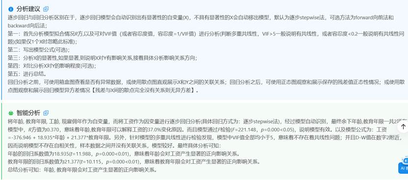 在 SPSSAU 平台中,逐步回归分析流程已实现自动化,并提供: