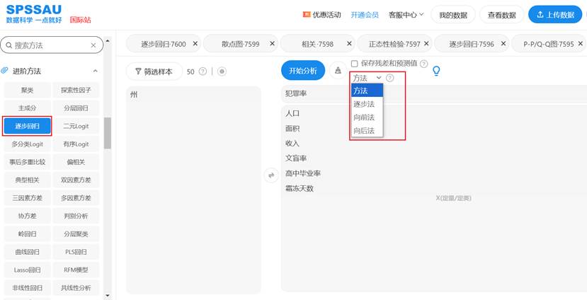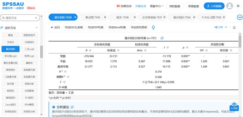 SPSSAU 平台提供了完整的逐步回归模块,能够以可视化、自动化方式实现变量选择、模型拟合、诊断与结果解释,从而帮助研究者更高效地构建合理的线性模型。