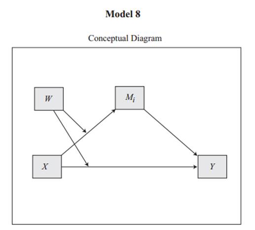 Model 8时:图中W即为调节变量。调节变量针对X->M和X->Y这2条路进行调节。