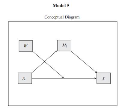 Model 5时:图中W即为调节变量。调节变量仅针对X->Y这一条路进行调节(准确说Model 5并不是调节中介作用,只是模型中已经考虑了中介作用而已)。