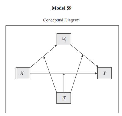 Model 59:图中W即为调节变量。调节变量针对X->M,X->Y和M->Y这3路进行调节。