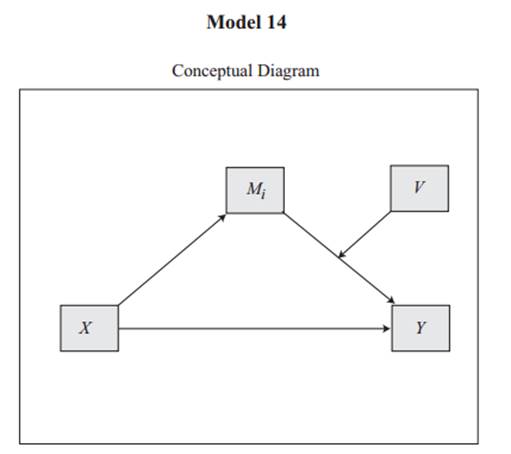 Model 14时:图中V即为调节变量。调节变量仅针对M->Y这一路进行调节。