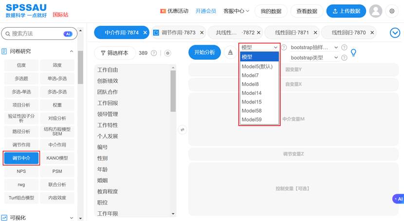 在SPSSAU平台中,这一选择过程变得十分简便,研究者只需根据理论研究假设确定调节发生的位置,然后在分析界面中选择对应的模型编号即可。系统会自动构建相应的统计模型,大大降低了技术门槛。操作如下图: