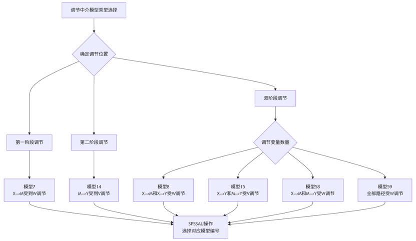 该流程图详细展示了如何根据调节变量的作用位置选择对应的Process模型。例如,当调节变量作用于自变量与中介变量之间时(第一阶段调节),应选择模型7;而当调节变量同时影响多个路径时,则需要根据具体的影响路径选择模型8、15、58或59。下面依次进行简单介绍。